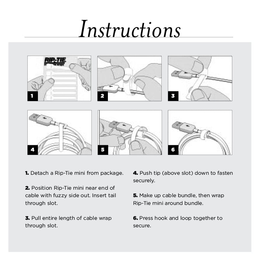 Any small cable bundle can be controlled with the Rip-Tie Mini. Perfect for USB adapter cables or earbud cords.Each package contains a quantity of seven 1/4 x 3-1/2″ wraps. Available in bulk quantity packages of 56, 252, 1008 and 2016 bulk packs for commercial applications. Tested for up to 200 release cycles.