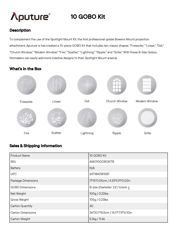 To complement the use of the Spotlight Mount Kit, the first professional-grade Bowens Mount projection attachment, Aputure has created a 10-piece GOBO Kit.
