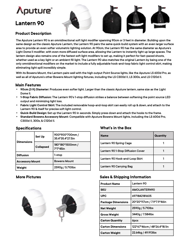 - 90cm (3 ft) Diameter: Produces even softer light. Larger than the classic Aputure lantern, same size as the Light Dome II.