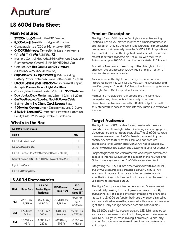 The Light Storm 600d is a perfect light for any demanding lighting situation you may encounter as a cinematographer or photographer. Utilizing the same light source as its professional predecessor, its immensely powerful 600W COB LED positions the LS 600d as one of the brightest point source LEDs on the market. It outputs an incredible 8,500+ lux with the Hyper-Reflector or up to 29,300+ lux at 3 meters with the F10 Fresnel.