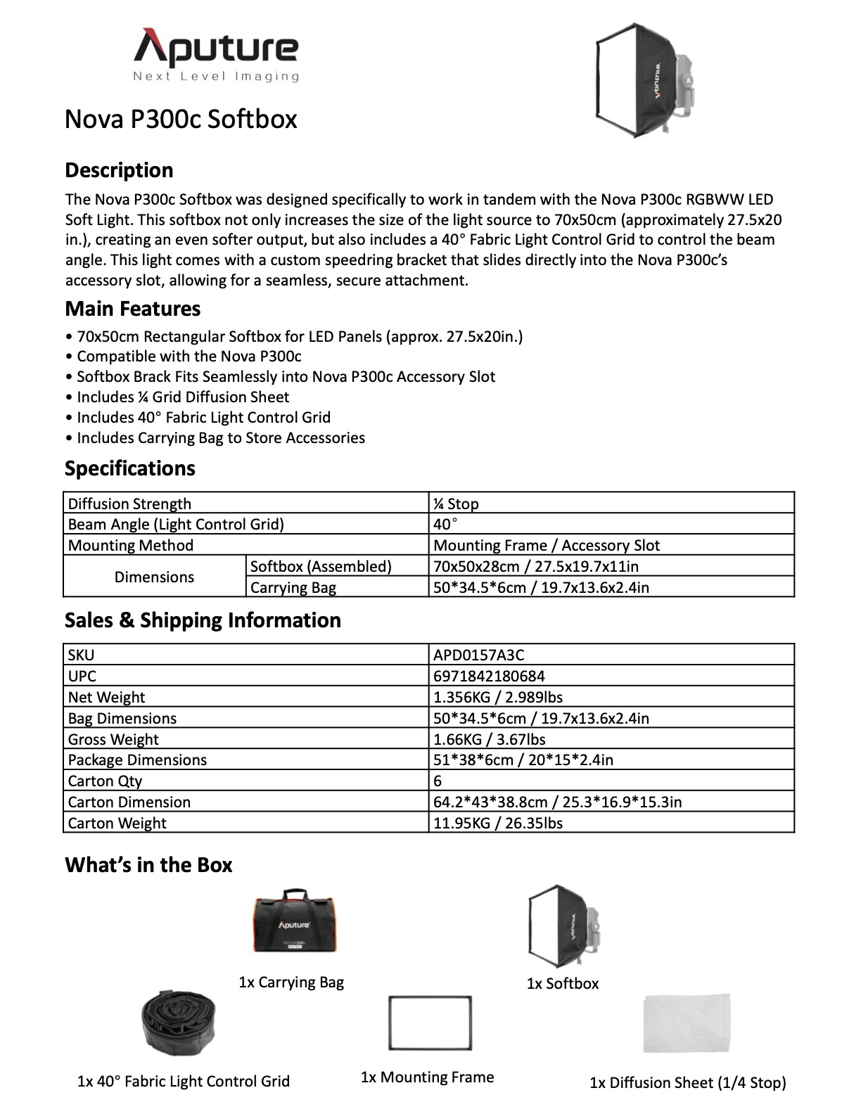 The Nova P300c Softbox was designed specifically to work in tandem with the Nova P300c RGBWW LED Soft Light. This softbox not only increases the size of the light source to 70x50cm (approximately 27.5×20 in.), creating an even softer output but also includes a 40° Fabric Light Control Grid to control the beam angle. This light comes with a custom speedring bracket that slides directly into the Nova P300c’s accessory slot, allowing for a seamless, secure attachment.