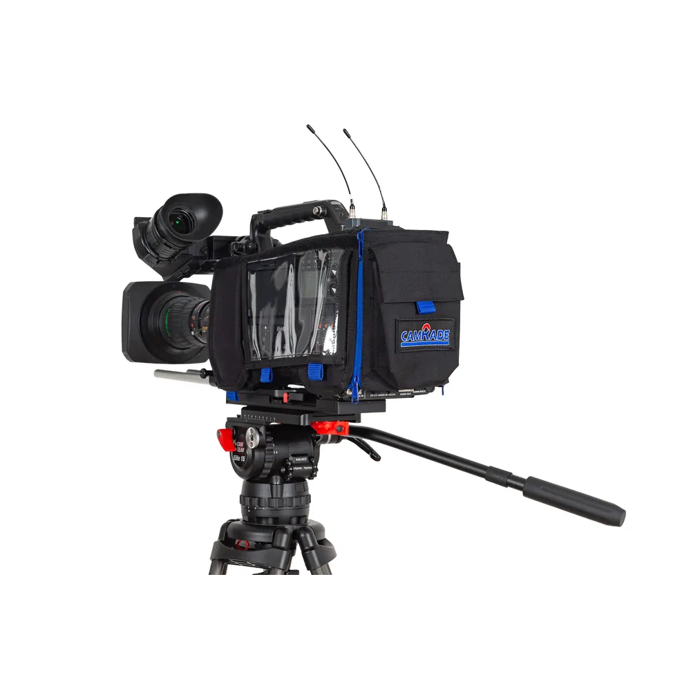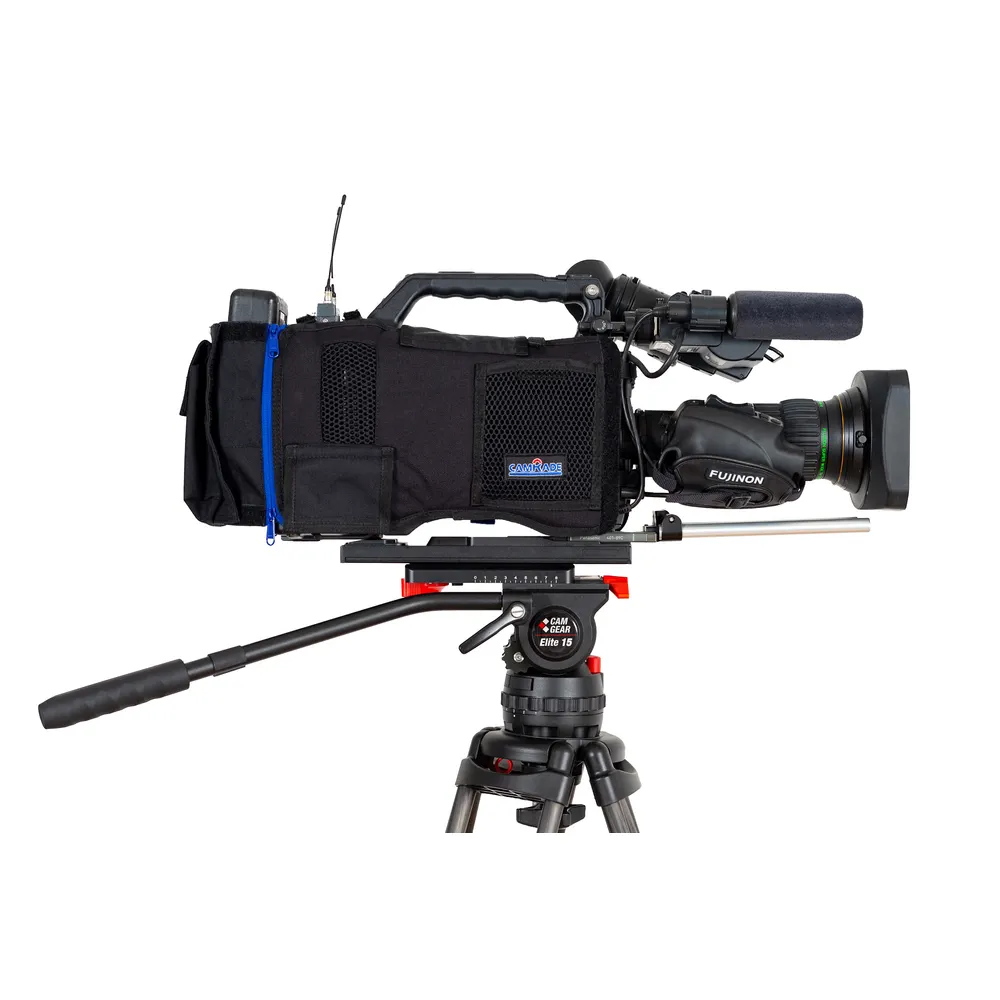 The camRade camCover P2 is a black, custom-fit protective cover that fits specific models of Panasonic ENG- style shoulder cameras. It protects against scratches resulting from daily wear and tear, increases the lifespan of the camera body and ensures it remains in perfect condition. The built-in camRade rainProtector helps you protect your camcorder whenever the weather turns, or dust is kicked up. The camCover P2 is an absolute must-have that can prevent damage to your most valuable piece of equipment. The camCover is designed and suitable for shoulder camera work but is also great while your camera is attached to a Panasonic (SHAN) VCT -plate, tripod, pedestal, or any other camera support solution.