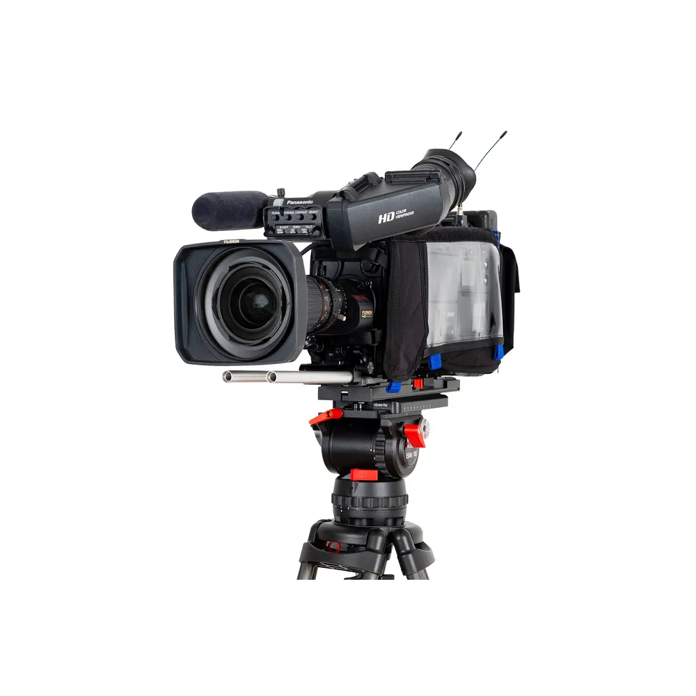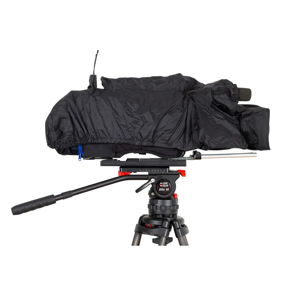 Protective camera cover for most Panasonic ENG shoulder cameras. It includes a body cover, built-in rain protection cover, wireless transmitter pouch, and storage pouch.