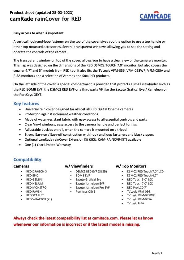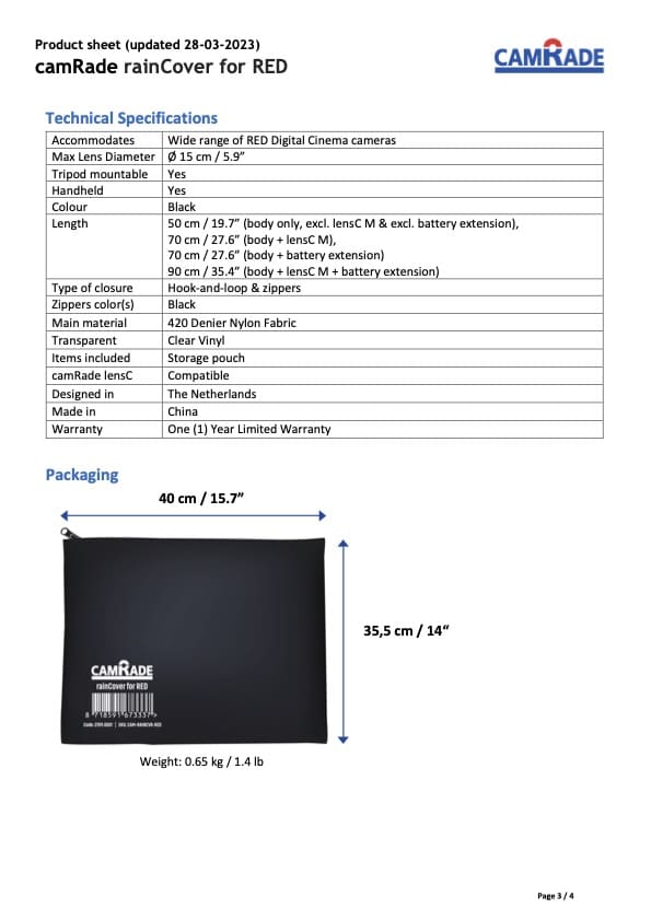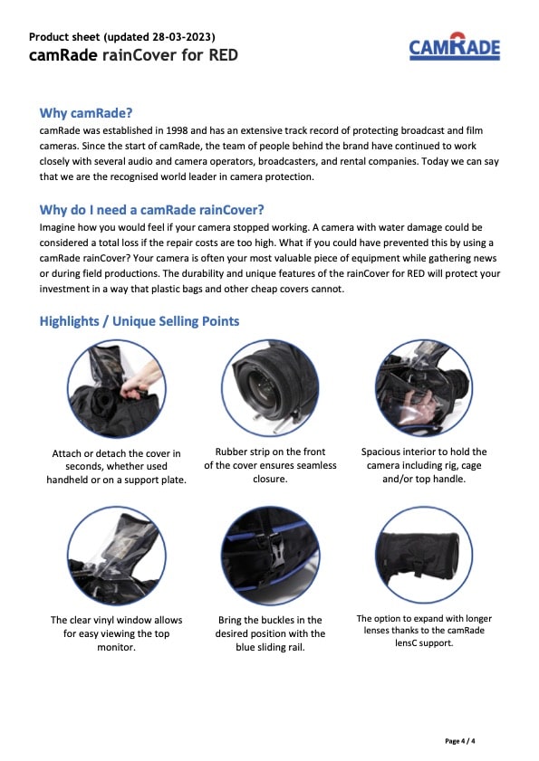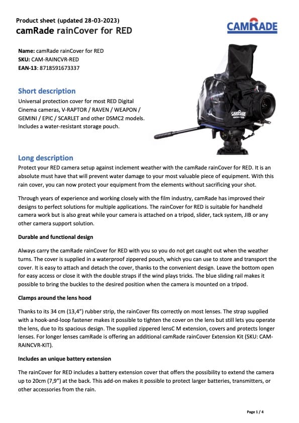 Optional camRade rainCover Extension Kit (SKU: CAM-RAINCVR-KIT) available