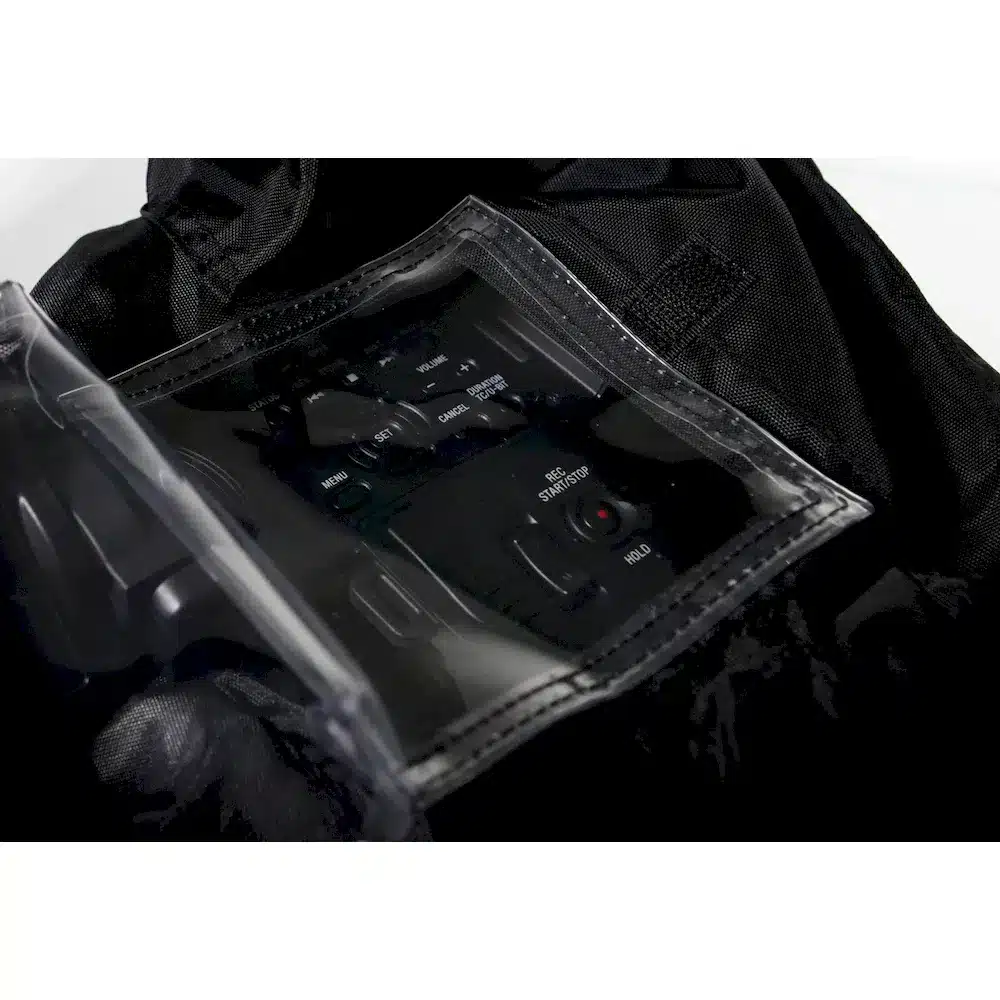 With several zippered and hook-and-loop openings you can easily access all essential parts of the camera. From openings for MI shoe connectors, wireless antennas, microphone and viewfinder, to a transparent window on the side for the LCD monitor, this rain cover has it all. The transparent back of the cover easily opens to change the camera’s battery or quickly access cables.