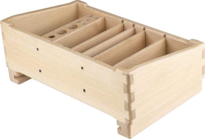 The Kupo Camera Assistant Front Box is made of high-quality European beech and comes with a natural finish. It features four removable and interchangeable dividers to customize your particular needs. The camera assistant front box also features a pen holder that is in a fixed position and includes variously sized holes for pens and essential cine tools. Slots on the underside of the front box conveniently holds a standard sized slate movie clapboard.