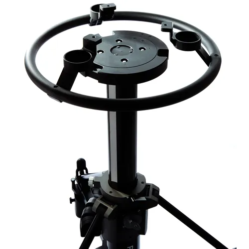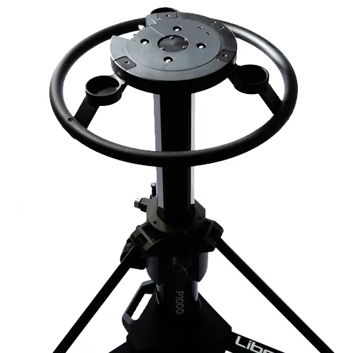 The P1000 is equipped with the tracking locking mechanism and cable guards which come standard with the large-sized double-wheel 125mm / 4.9″ casters. The tracking locking mechanism ensures straight-line movement by locking the caster direction, while the cable guards prevent the wheels from running over the cable during studio production. The gas spring inside the P1000 pedestal supports the mid column´s elevation, allowing safe and easy height adjustments and setups with heavy equipment. It can also be easily disassembled into the P1000 column, the steering handle and the Dolly. This makes it easy to transport within studios and outsite broadcast sites. The air pressure can be easily checked with the air pressure meter. The P1000 Flat Base is not only compatible with Libec heads but other brand heads as well. With optional accessories, ball based heads can also be attached on this pedestal. The upper column friction can be adjusted to preferred setting with the drag knob.