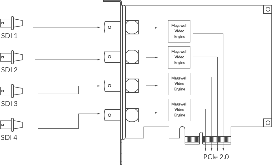The Magewell Pro Capture Quad SDI is a High-performance, low-latency PCIe capture card. This Four-channel HD PCI card captures SD/HD/3G/2K SDI signals with embedded audio and supports input resolution up to 2048×1080 pixels.