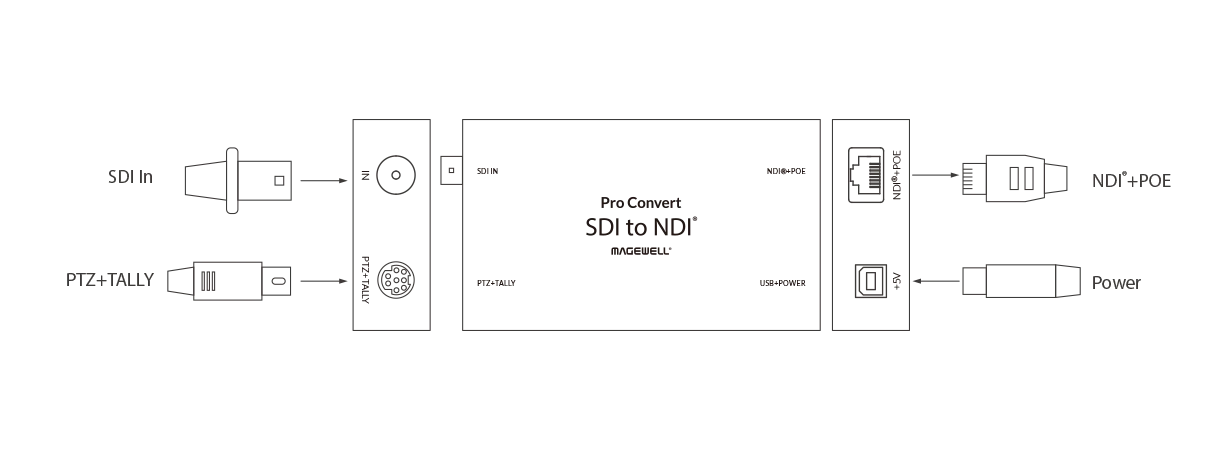 The Magewell Pro Convert SDI TX converts one HD 3G-SDI input signal into Full NDI®, enabling users to connect existing source equipment into NDI or IP media networks. This device supports one SDI video signal up to 2048×1080 60fps with 8bit NDI encoding up to 2048×1080 60fps.