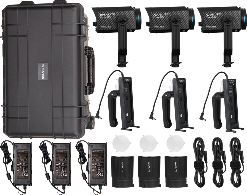 The Nanlite Forza 60C RGBLAC LED Spotlight 3-Light Kit is a set of lightweight and ultracompact fixtures that feature a 6-color mixing technology that incorporates lime, amber, and cyan LED beads into the light source making it possible to produce highly accurate daylight-balanced 5600K light, an ultra-wide CCT range of 1800K-20000K, and notably vibrant and rich colors. The lights are small, but their output is large — delivering 12,810 Lux @ 1M (1190 fc) at 5600K. The Forza 60C is ready to work in the studio plugged into a standard AC outlet or in the field with power from NP-F or V-Mount batteries. Included accessories like the rolling hard case, Bowens-Mount adapters, and battery handgrips make it a complete solution and an essential addition to your kit.