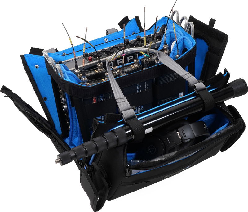 • Detachable front pouch with transparent TPU top cover for up to six wireless receivers and additional accessories.