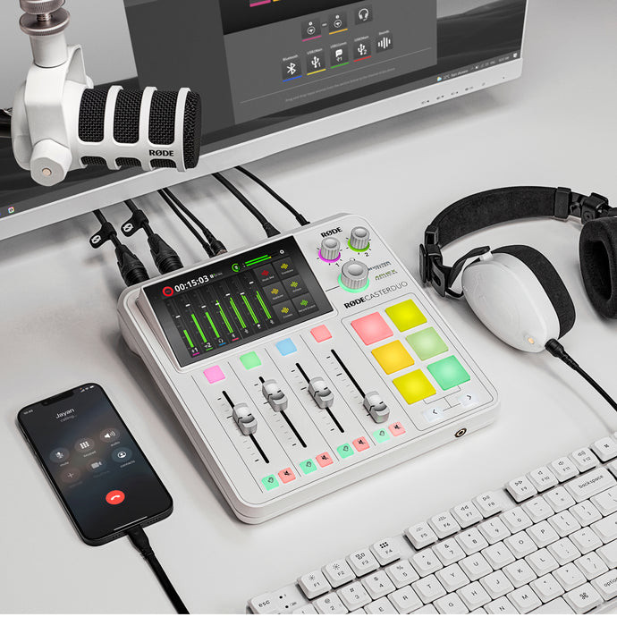 The RØDECaster Duo is a compact and incredibly powerful all-in-one audio production solution for podcasters and content creators. It features two high-quality Neutrik® combo inputs for connecting microphones, instruments or line-level devices, a 3.5mm TRRS headset input, and integrated wireless receiver for connecting RØDE wireless microphones, making it incredibly versatile. Ultra-low-noise, high-gain Revolution Preamps™ and studio-grade APHEX® audio processing delivers pristine audio quality, with dual USB-C interfaces for connecting two computers or mobile devices and Bluetooth connectivity for seamless phone call integration. The RØDECaster Duo is fully customisable, with seven individually assignable channels and six programmable SMART pads for on-the-fly triggering of sound or voice FX and other actions.