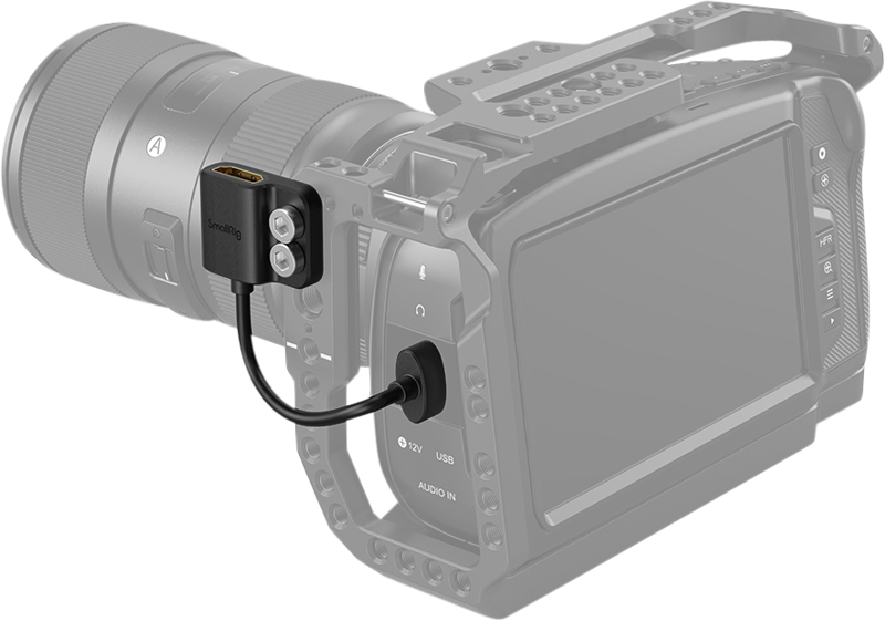 It features two 1/4-20″ screws to fix the female part to the side of the camera cage or L bracket tightly to protect the camera’s HDMI port and ensure a more stable connection.