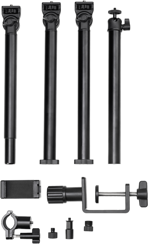 1/4″-20 screw, phone clip, lamp holder, 1/4″-20 to 3/8″-16 adapter and 1/4″-20 to 5/8″-11 adapter make it highly compatible with various devices, such as SLR camera, ring light, flat panel light, focus light, microphone, mobile phone, etc