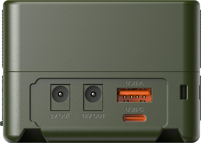 The battery is equipped with a BP, a D-Tap, an 8V-OUT DC, a 12V-OUT DC, a USB-C, and a USB-A ports offering a wide range of interfaces for powering multiple devices simultaneously.