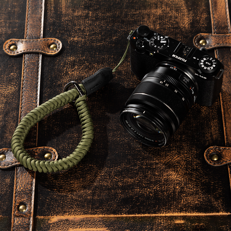 The wrist strap is installed by threading the rope directly through the camera shoulder strap loop, which is compatible with most camera shoulder strap interfaces.