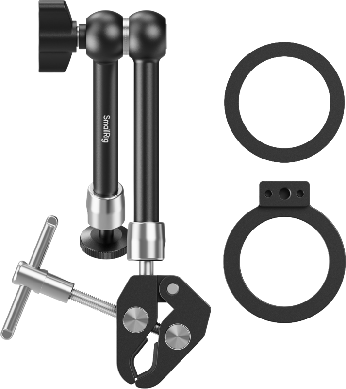 Consists of an integrated magic arm with a crab-shaped clamp, a MagSafe mount, and a metal ring. One end features a 1/4″-20 screw that pairs seamlessly with the MagSafe mount for quick setup with iPhones and MagSafe-compatible devices, or it can be used with the metal ring for non-MagSafe Android phones and other devices
