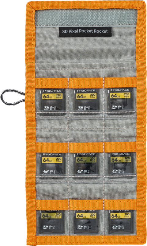 Convenient wallet for 9 SD or CFexpress Type A memory cards that fits easily in your pocket or attaches to your belt or bags.