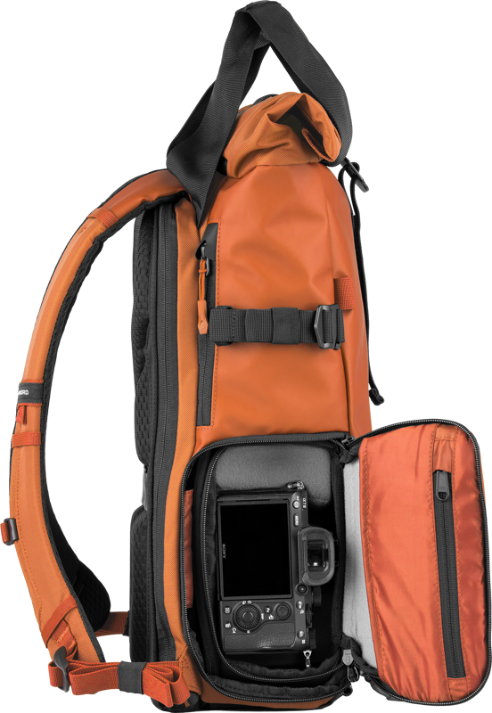 • Side camera access and full clamshell opening to the main compartment.