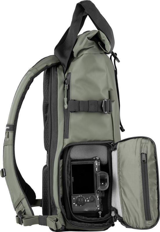 - Side camera access and full clamshell opening to the main compartment.