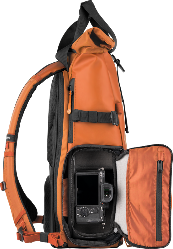 • Side camera access door plus full clamshell rear opening to the main compartment.