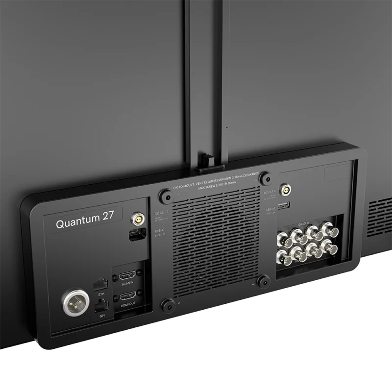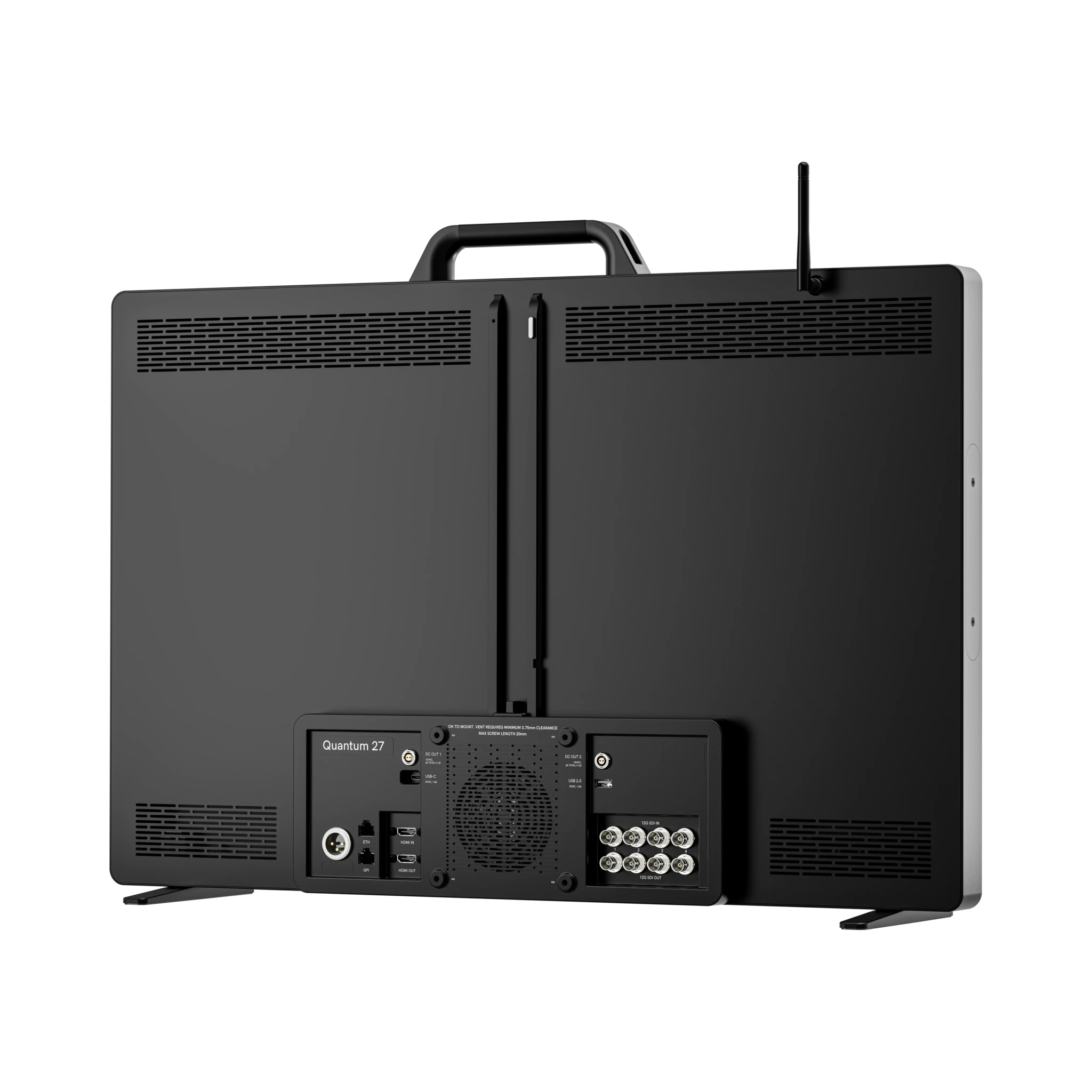 Quantum 27 boasts a resolution of 3840 x 2160 (UHD), 10-bit color processing, 1,500,000:1 contrast ratio, four 12G/6G/3G/HD-SDI inputs and outputs. The Unibody Smart Chassis offers multiple interchangeable mounting points, DC power input and 2-pin power output, 100mm VESA Mount, Dovetail mounting rail for batteries and other accessories, and new built-in WiFi support for wireless remote monitor control. Quantum 27 ships ready for color-critical studio and broadcast desktop use and includes optional top handle and cheese plate inserts for on-set mobility and accessory
