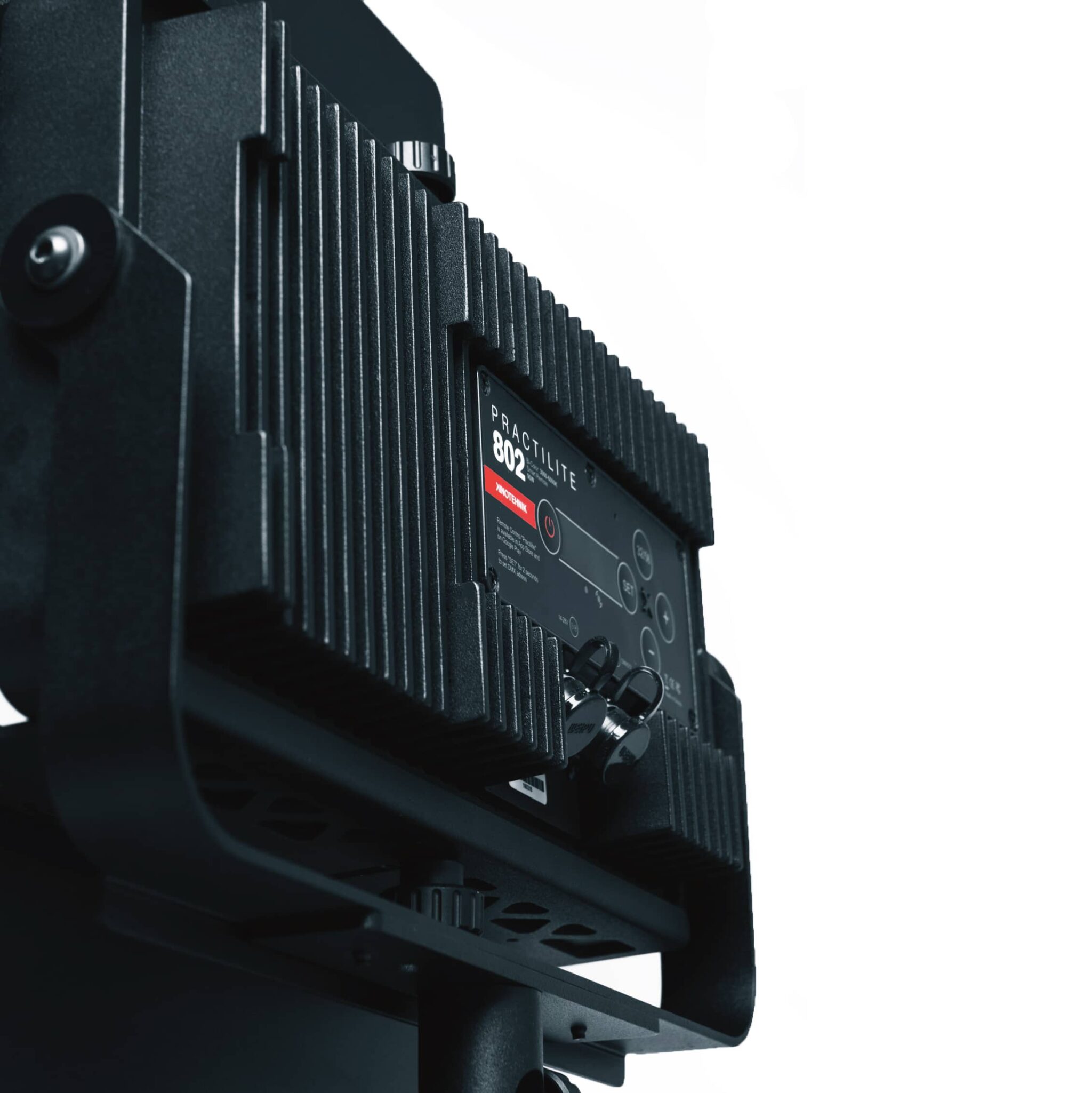 The Practilite 802 is flicker-free, which allows for perfectly lit slow-motion shots. The lights can also be DMX daisy-chained for use in a cluster. Another means of control is the Bluetooth Practilite App for tablets and smartphones that features a simple, intuitive graphic user interface (GUI) that permits brightness and color control of up to six fixtures (including Practilite Fresnels) at distances up to 30′. A further indication of versatility is the panel’s power options. The light can run on AC worldwide with the included 100 to 240 VAC adapter or on batteries with the purchase of an optional V-Lock or G-Mount for situations where the mains power is unavailable. Power, compact size, versatility, and advanced technology make the Practilite 802 a smart choice.