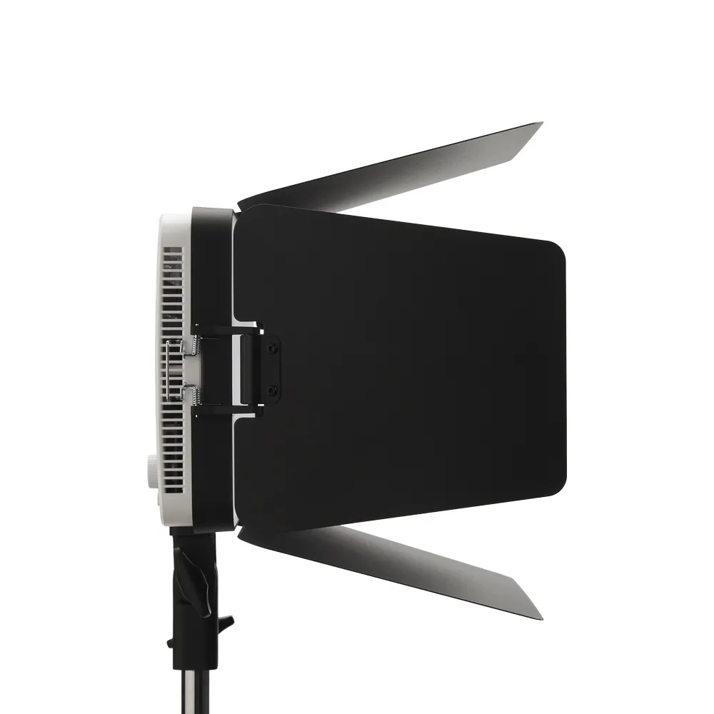 Fast and secure setup. Featuring a wire clasp design, the Barn Doors easily mount onto the amaran Pano 60c, ensuring a secure attachment to the sides of the panel light while allowing for quick setup and removal.