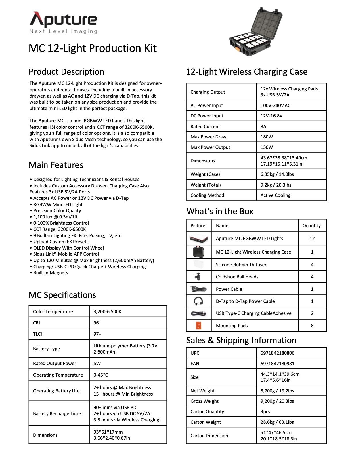The Aputure MC 12-Light Production Kit is designed for owner-operators and rental houses. Including a built-in accessory drawer, as well as AC and 12V DC charging via D-Tap, this kit was built to be taken on any size production and provide the ultimate mini LED light in the perfect package.