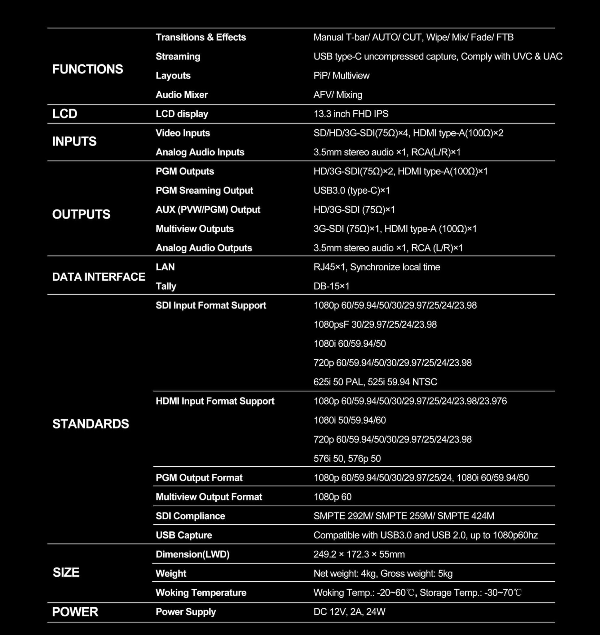 - Outputs: 2×SDI &1×HDMI PGM, 1×SDI PVW, 1×SDI & HDMI multiview