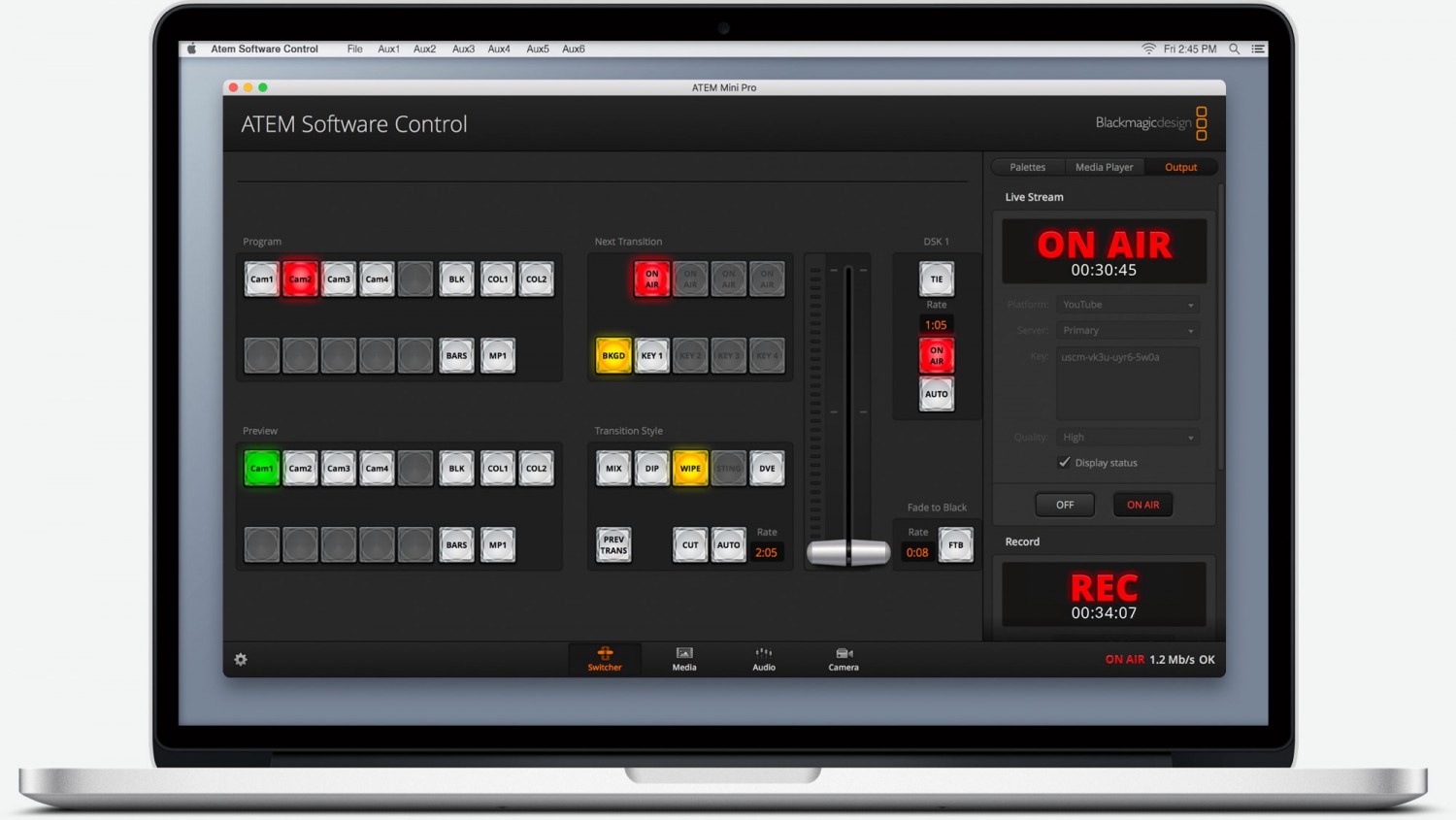 The HDMI program output is perfect for connecting ATEM Mini into an external recorder or monitor. ATEM Mini supports recorders such as the HyperDeck Studio Mini and Blackmagic Video Assist. Customers get a high quality output with switcher program video, plus live audio from the internal audio mixer. The HDMI output can even be connected to video projectors in large venues. If customers connect the ATEM Software Panel customers can even change the HDMI output direct from any of the video inputs. There’s also a low latency setting allowing output of connected gaming consoles on the HDMI output. If customers enable broadcast style mix effects switching, the HDMI output can be used to preview sources before a transition.