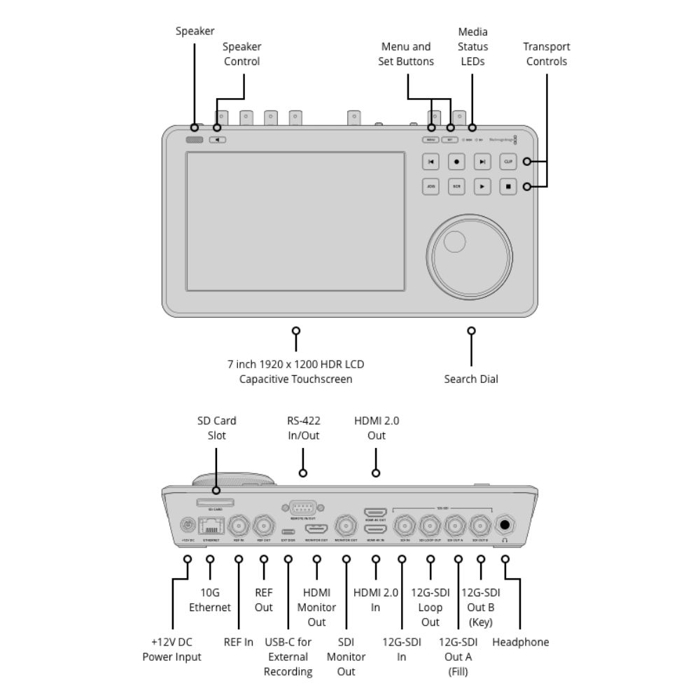 - Recorder configuration: via user interface on HDMI output or via Blackmagic HyperDeck protocol over Ethernet