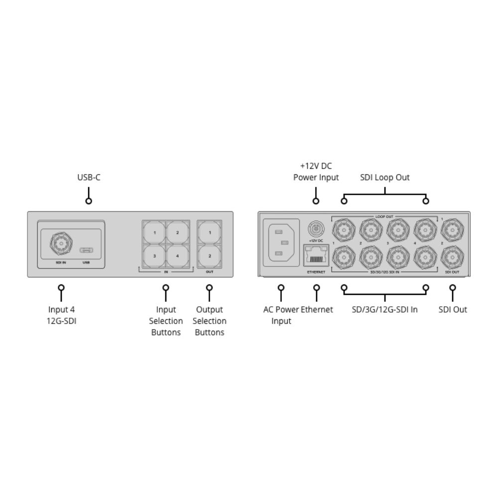 A front panel control panel allows for quick video signal routing, and also includes an emergency 12G-SDI input for connecting external equipment and a USB-C output for use as a webcam. The device also supports SDI signal re-clocking and remote control via Ethernet.