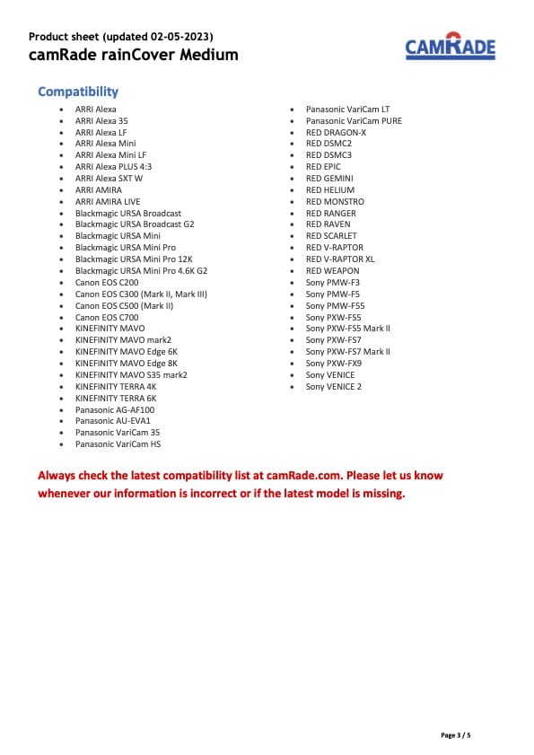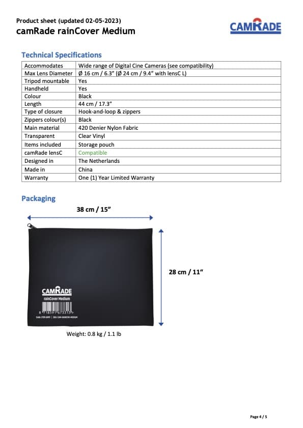 Through years of experience and working closely with multiple camera operators, camRade has improved their designs to perfect solutions for multiple applications. The rainCover Medium is suitable for handheld camera work but is also great while your camera is attached on a tripod, slider, track system, JIB or any other camera support solution.