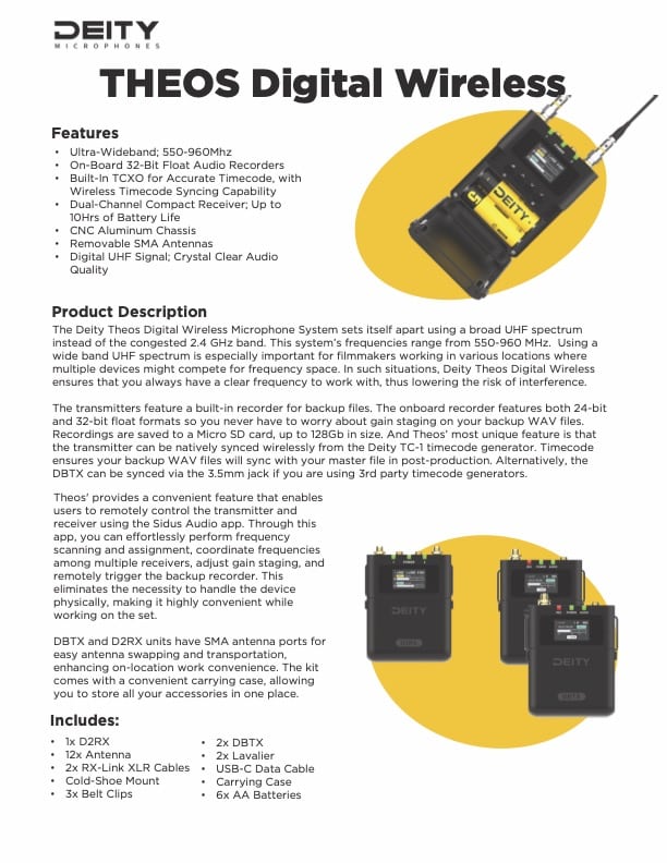 As a filmmaker, one of the most important aspects of your work is sound. There is nothing more frustrating than discovering that your audio is unusable due to interference, dropped signals or other issues. This is where the Deity Theos Digital Wireless Microphone System comes in. This state-of-the-art system is designed to make your audio recording process as seamless and stress-free as possible.