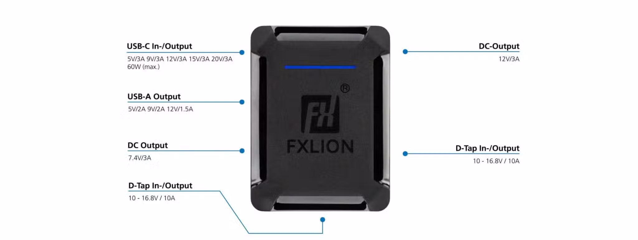 The NANO HUB allows powering different equipment with one hub that you can power from different Inputs. Use 14.8V batteries or D-Tap chargers as input, 14.8V/12V/7.4V/USB-A /USB-C outputs are working at same time.