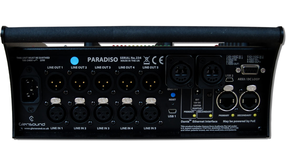 Audio links between the Paradiso and other equipment are by Dante (AES67 compliant) complete with redundant copper & fibre links. Analogue I/O and AES3 I/O are also provided directly from the unit for local connections and/ or another layer of redundancy.