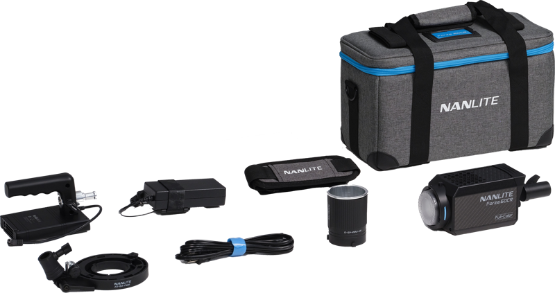 A Bowens-mount adapter with an umbrella holder is included with the Forza 60C RGBLAC for nearly unlimited light-shaping options. A battery handgrip is also included, which has plates for 2 NP-F batteries, an LED battery-life meter, and a stand mount. All the included items fit perfectly into the padded case, so you will have them at every shoot.