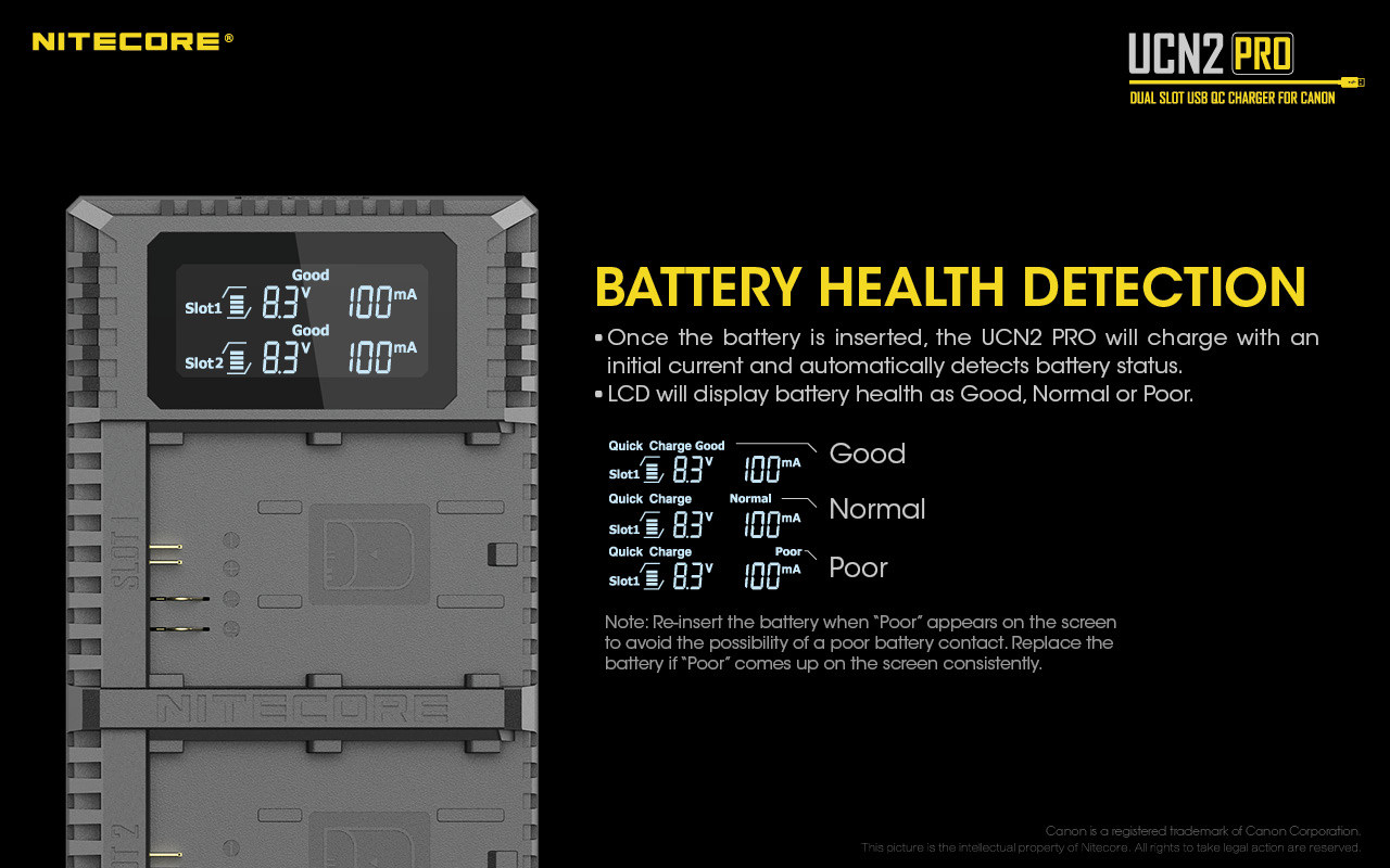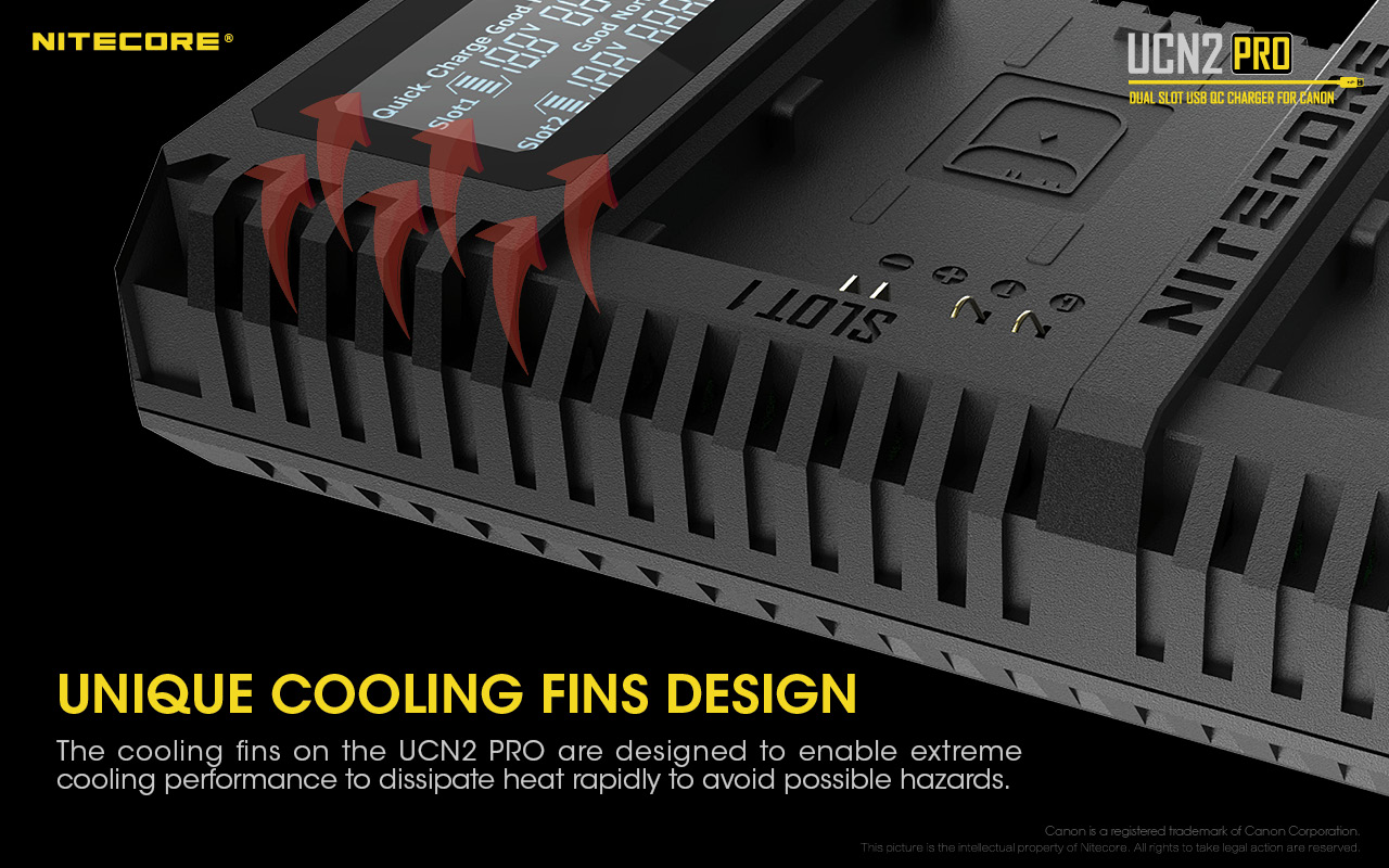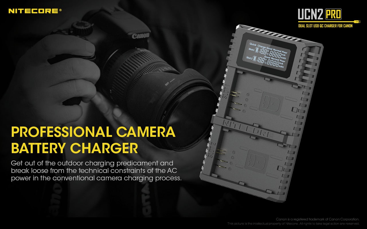 Introducing the NITECORE UCN2 Pro intelligent USB dual-slot superb battery charger designed to recharge Canon LP-E6N batteries fast, safe and efficiently. The UCN2 Pro can charge two LP-E6N batteries simultaneously with a maximum output of 800mA in either slot when using a 2A output USB power adapter. When the charger is connected to a quick charge (QC) power adapter, the screen will show Quick Charge and a single slot will achieve a max output of 1200mA. The UCN2 Pro supports the LP-E6N battery for popular Canon EOS models including 5D Mark II, 5D Mark III, 5D Mark IV 60D, 70D, 6D, 6D Mark II, 80D, 7D and 7D Mark II cameras.