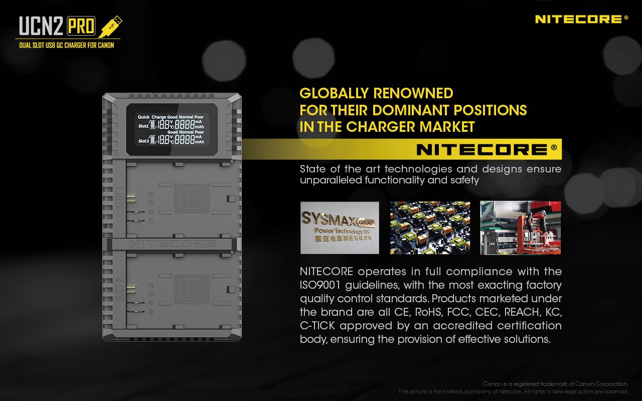 Nitecore UCN2 PRO dual slot digital USB charger for Canon LP-E6N batteries
