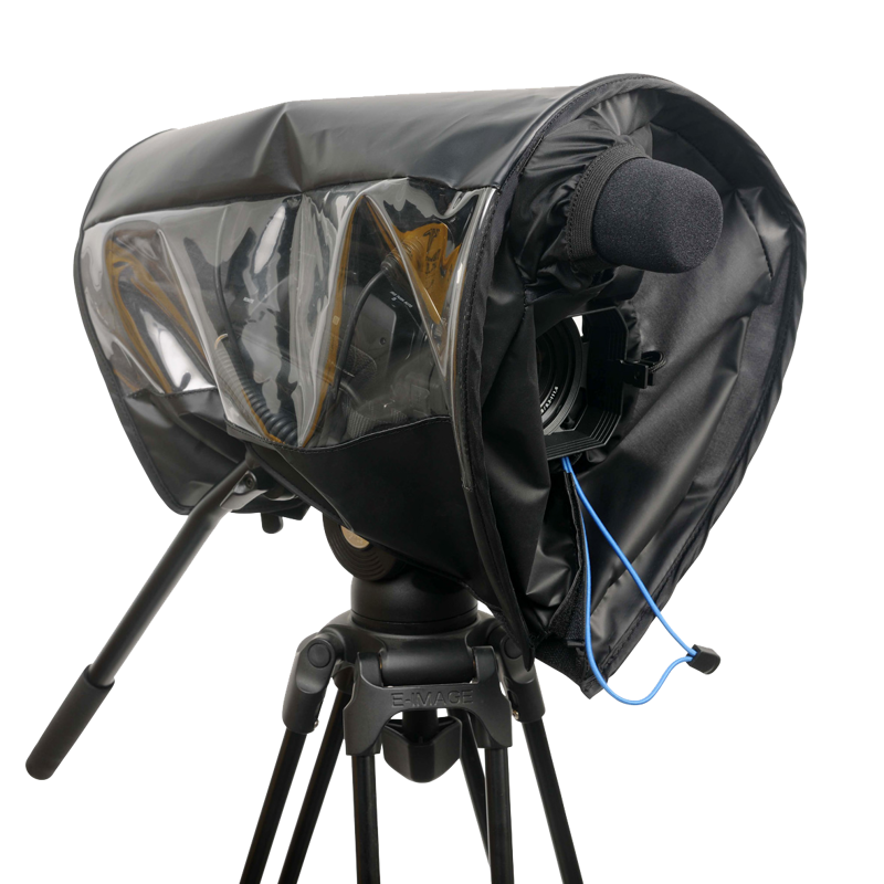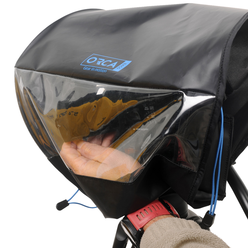 The front sleeve has a pull tight bungee cord system to secure the front lens hood and rubber sleeves at the front and back allowing the camera operator to expose the back viewfinder and the front audio microphone. The lower part of the cover is made with hook & loop to seal on the bottom of the camera when using any camera mounting support while still allowing easy access from the bottom. ORCA rain covers have successfully protected small video cameras from a variety of different weather conditions.