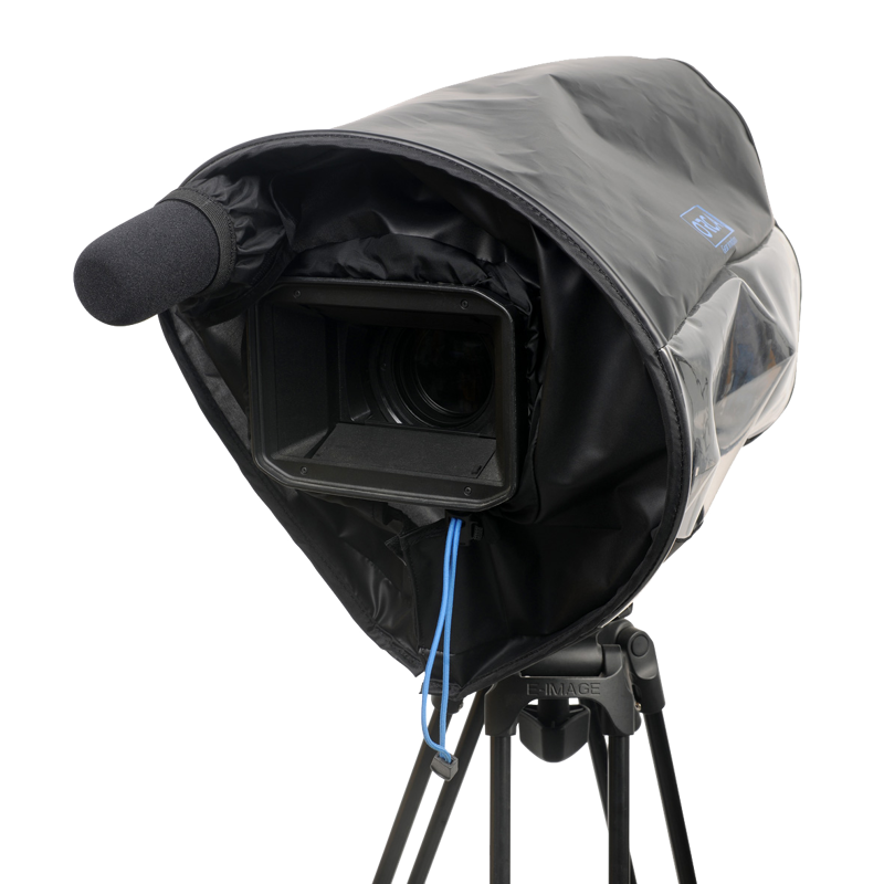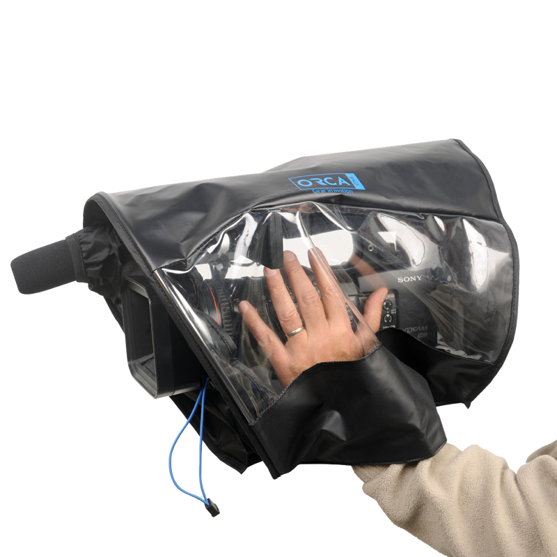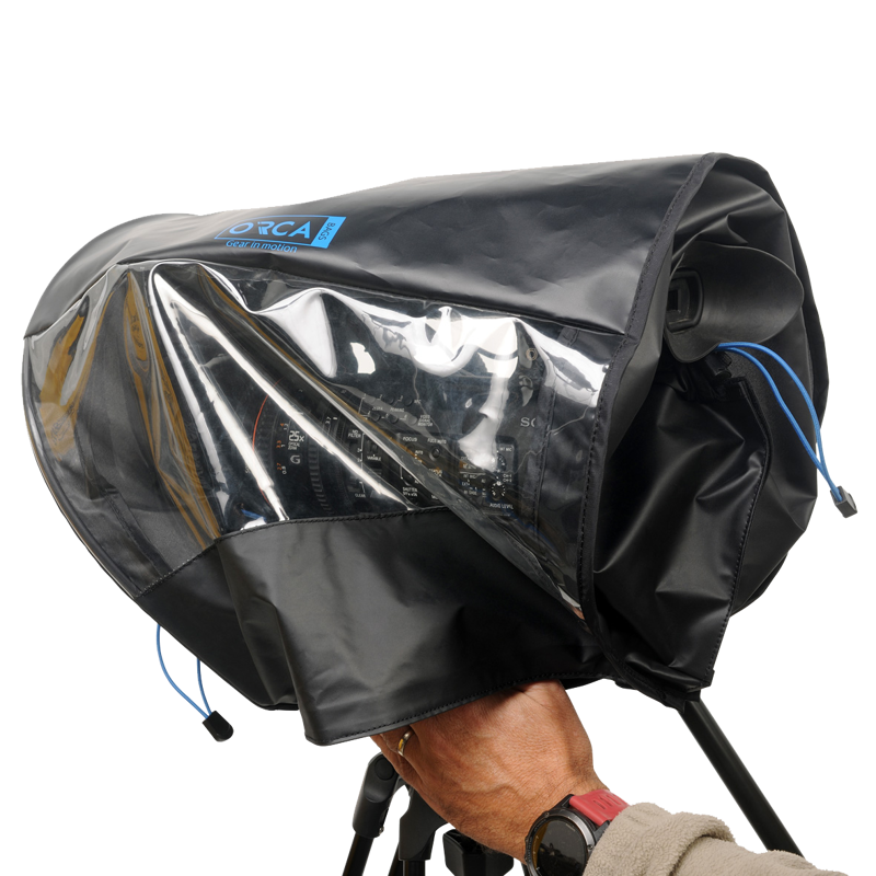 The front sleeve has a pull tight bungee cord system to secure the front lens hood and rubber sleeves at the front and back allowing the camera operator to expose the back viewfinder and the front audio microphone. The lower part of the cover is made with hook & loop to seal on the bottom of the camera when using any camera mounting support while still allowing easy access from the bottom. ORCA rain covers have successfully protected small video cameras from a variety of different weather conditions.