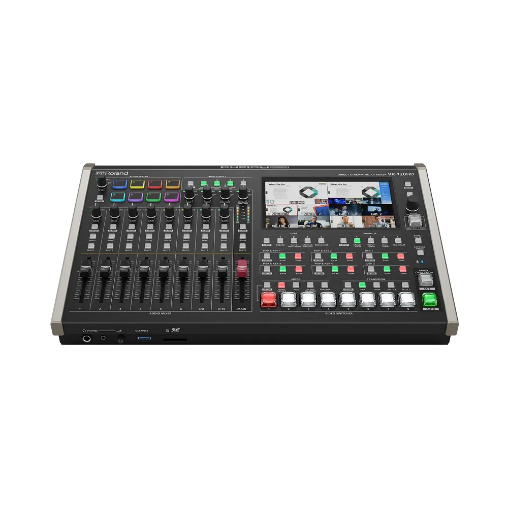 With the VR-120HD Direct Streaming AV Mixer, a single operator can confidently manage hybrid live and online productions without the need for external gear and the staff to run it. Offering extensive audio and video I/O, a large touchscreen, and hands-on controls, this portable powerhouse gives you the tools you need to take on any mid-level production. Advanced Roland AV features make difficult tasks simple with customizable workflows, deep automation functions, remote PTZ camera control, one-touch macro sequencing, streaming over LAN and USB, and much more.