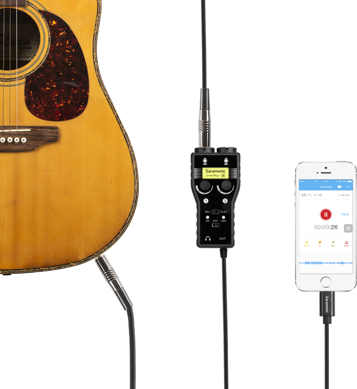 The Saramonic SmartRig+ Di is a two channel audio interface. It allows you to connect professional microphones/guitars to record quality sound or create music with your iPhone, iPad and iPod touch.