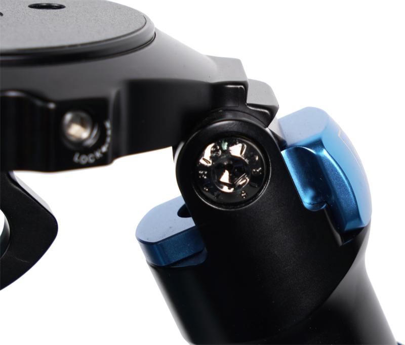 The carbon fiber legs have independent spread and three locking positions for a variety of heights and to help achieve level on uneven terrain.
