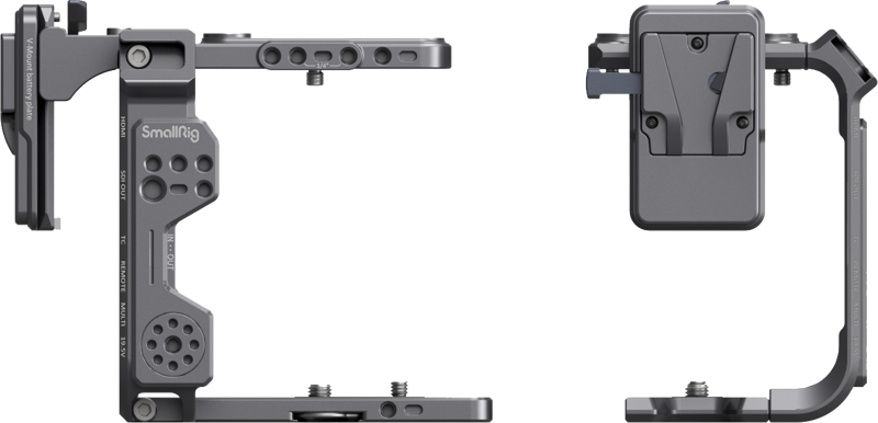 A lightweight, compact, and designed to attach accessories and provide protection. It consists of a top plate, a V-mount battery plate, a side plate, a baseplate, and a power cable.