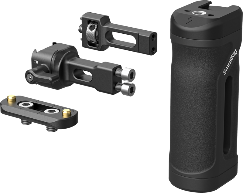 Designed for comfortable handheld shooting. The kit includes a side handle, a NATO clamp connector, a 1/4″-20 locating screw connector, and a NATO rail, ensuring seamless integration with various camera cages.
