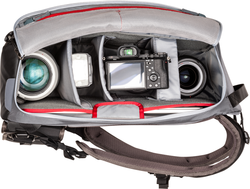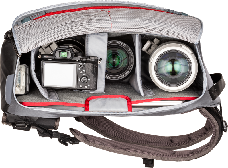 - Fits an ungripped DSLR, 3–5 lenses including a 70–200mm f/2.8 attached and up to a 15” laptop.