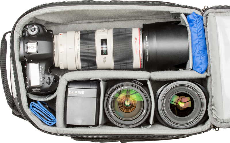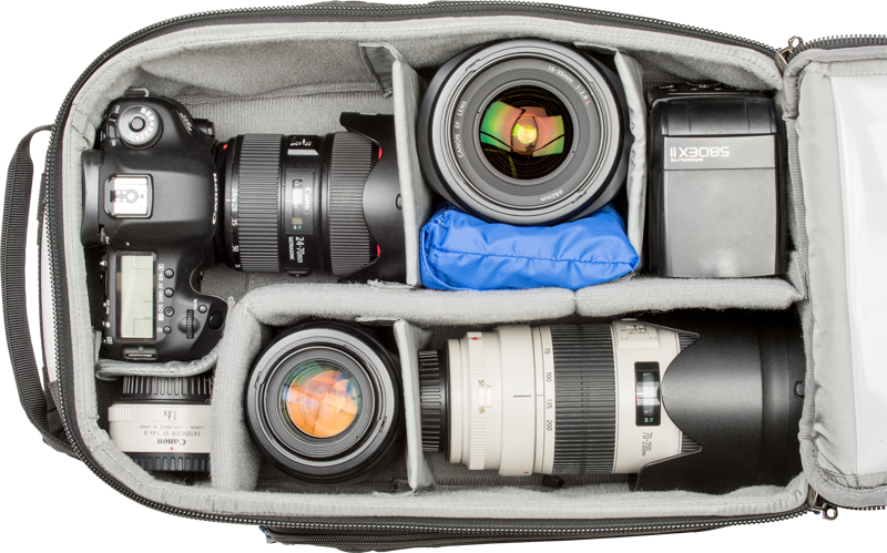 • Holds 2 standard DSLR bodies, 3–4 standard zoom lenses, and a 10” tablet