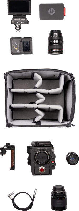 • Holds a camera body with lenses and accessories in a compact footprint.